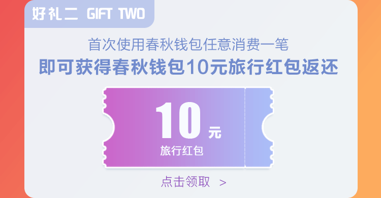 5. 活动期间内,首次使用春秋钱包支付任意消费,即可获得春秋钱包10元旅行红包,红包将返还至春秋钱包账户。