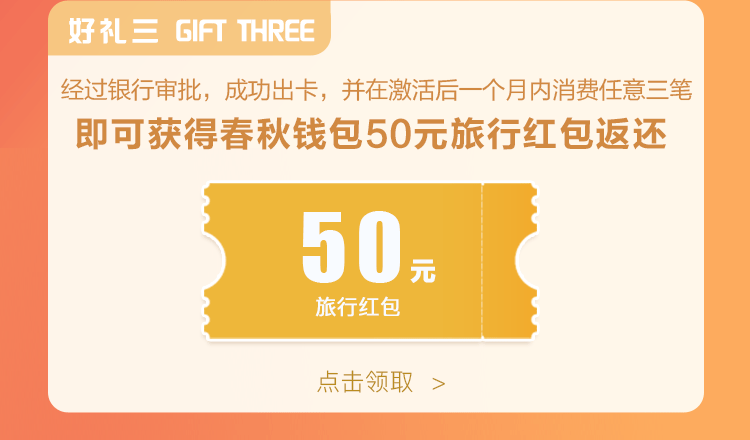 6. 旅客申请的春秋龙卡经建设银行批核出卡后,在活动期间内激活,可享受消费返礼:春秋龙卡在激活后1个月内任意消费三笔,即可获得春秋钱包50元旅行红包,红包将在第三笔消费完成后的次月进行返还,返还账户为旅客手机号绑定的春秋钱包账户;